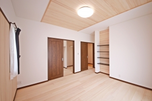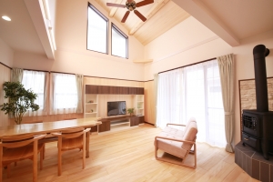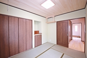 室内は全て引き戸で出入りし易く、明るく広々とした玄関ホール、勾配天井の吹き抜けLD、造り付けの仏間や神棚を備えた和室、屋根付きで約5帖の広さのウッドデッキなどが見所ポイントです。