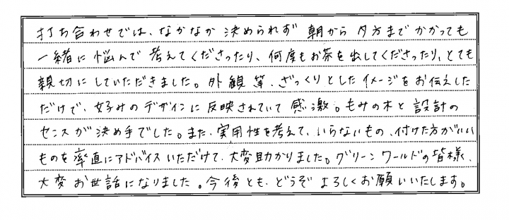 打ち合わせでは、なかなか決められず朝から夕方までかかっても一緒に悩んで考えてくださったり、何度もお茶を出してくださったり、とても親切にしていただきました。外観等、ざっくりとしたイメージをお伝えしただけで、好みのデザインに反映されていて感激。もみの木と設計のセンスが決め手でした。また、実用性を考えて、いらないもの、付けた方がいいものを率直にアドバイスいただけて、大変助かりました。グリーンワールドの皆様、大変お世話になりました。今後とも、どうぞよろしくお願いいたします。