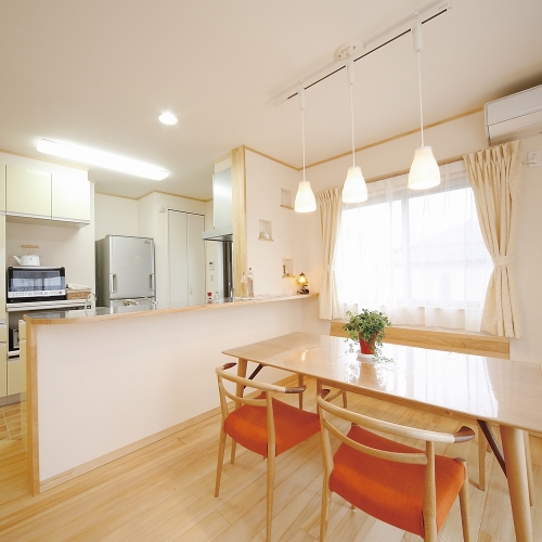 吊下げ照明がかわいいダイニングスペース。出来上がったお料理を並べておけるキッチンカウンターも便利です。