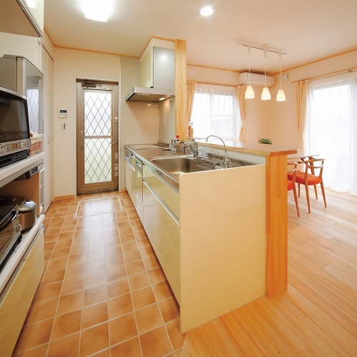 汚れがちなキッチンの床はCFに。テラコッタ調の柄がもみの木の床ともマッチし、可愛らしく仕上がっています。