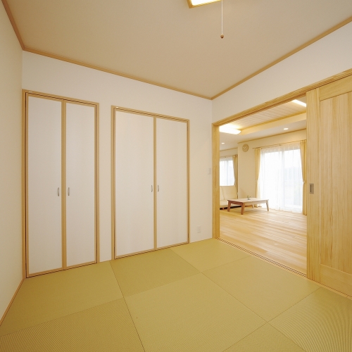 リビング奥には多目的に使用できる和室を配置。リビングの続き間として開け放しておいても違和感の無いよう、縁無畳と木目の引き戸を採用しています。