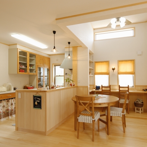 吹抜けになったダイニングスペースは、カウンターや収納棚で使い易く。もみの木の腰壁、そして奥様がコツコツ集められたカントリー調の家具や小物でコーディネートされ、明るく可愛い雰囲気になっています。
