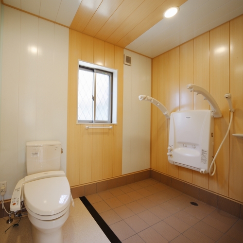 バリアフリー仕様のトイレ&シャワールーム。車椅子に座ったままシャワーを浴びることができる専用ユニット付きです。