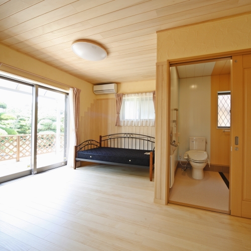 リビングダイニングと3枚引き戸で繋がる洋室は、天井と壁にもみの木を採用。ウッドデッキにも直接出られて、部屋の奥には水廻りが集約されています。