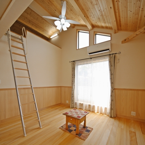 床と腰壁にもみの木を使った2階寝室。空間を広げる約3帖のロフトスペースと、写真手前側には畳コーナーを設置しました。