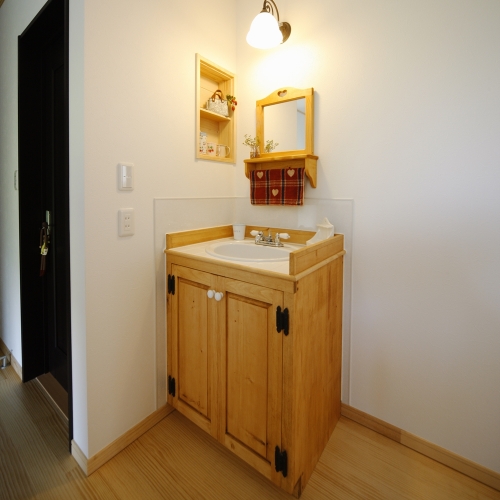 2階洗面台もカントリーテイストでコーディネート。脇のニッチも小物の収納や飾り棚として便利です。