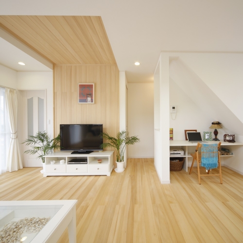 TVボードの背面と天井の一部にもみの木を張って奥行きも感じるアクセントに。その脇、扉を付けて収納にすることが多い階段下スペースは、カウンターを造り付けてオープンに。パソコンを置いて共用のワークスペースになっています。