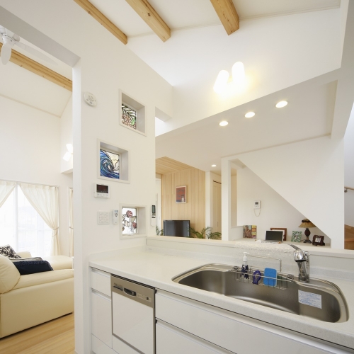 リビングとの一体感と使い易さを重視したL型キッチン。リビングとの間仕切り壁にはステンドグラスをあしらっています。