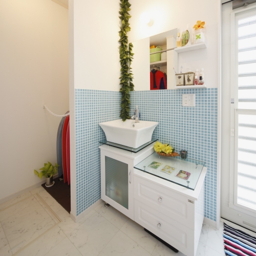 ご夫婦共サーフィンがご趣味ということで、洗面脱衣室に勝手口を設け、奥にボードやウェットスーツの収納場所を確保。勝手口を出たところには外シャワーも取り付け、外で砂をサッと流してすぐ室内に入ってくることができます。