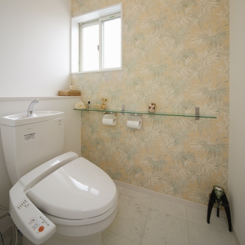 1Fのトイレは車イスでも余裕のある広さを予め確保。便器の後ろ側にも楽に手が届き、お手入れしやすく。小物を飾るのも楽しい空間になっています。