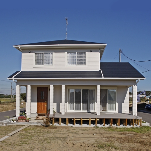 カバードポーチのハワイアンテイストな外観は、奥様が子どものころに描いたイメージを具現化。重ね張りの外壁と格子入りのサッシで、シンプルな中にもこだわりが感じられるデザインです。