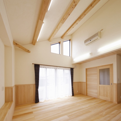 勾配・梁見せ天井+ハイサイド窓で、明るく開放感のあるLD。もみの木の腰壁もぐるっと回し、引戸の裏側にももみの木を貼って、その他は漆喰で仕上げました。エアコンは隠ぺい配管で高い位置に設置。