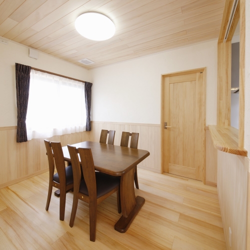 リビングとは一続きながら少し位置をズラして配置し、ダイニングとして独立したスペースに。天井ももみの木を貼っています。