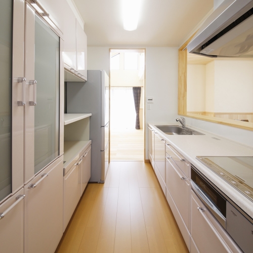 家の中央に配したキッチン。リビング~洗面脱衣室につながり、家事動線にも配慮されています。