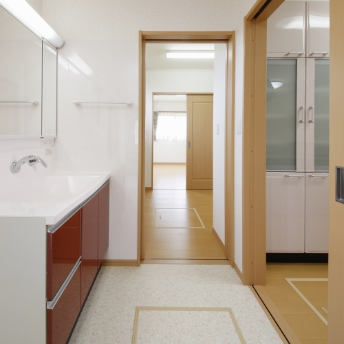 洗面脱衣室は、キッチン、ダイニング、ウォークインクローゼットを経て寝室の3方向につながる配置に。