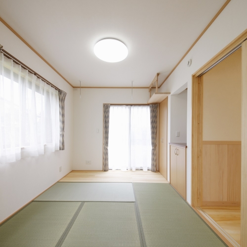 リビングと寝室につながる和室。南側はもみの木の板張りにし、室内物干し場としても利用。神棚とお仏壇置き場もお手持ちのサイズに合わせて造り付けました。