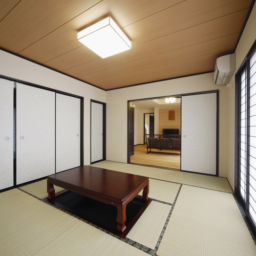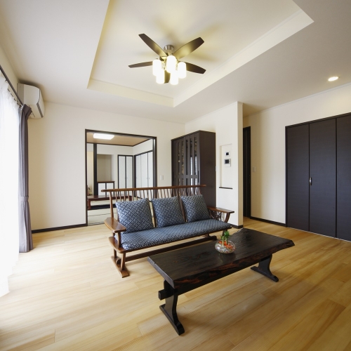 10帖の和室には、お母様リクエストの掘り炬燵を設置。2枚引込の襖戸でリビングと繋がり、左手はご両親の寝室に繋がっています。