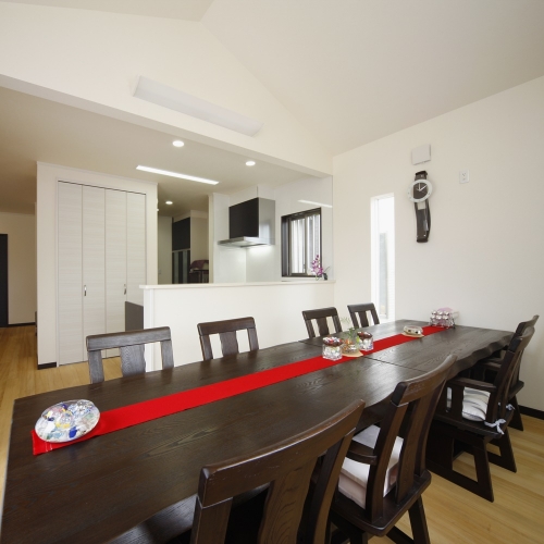ダイニングは近くに住むご親戚も頻繁に集まる為、大人8人が余裕を持って座れる広さ。勾配天井にし、ウッドデッキにも繋がっているので、明るく開放感があります。