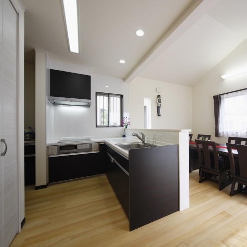 奥様とお母様が一緒にたつこともあるキッチンはL字型に配置し、作業スペースと収納スペースを広くとりました。写真左手には大型冷蔵庫2台が設置でき、食品庫も。