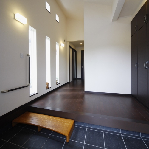 坪庭側にスリット窓とハイサイドライトを設けた玄関ホール。ご両親が昇降し易いよう、L型の手摺も設置しています。右手には大容量のシューズボックスと土間収納を設置。