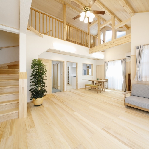 無垢の木材 もみの木 ホタテ漆喰 自然素材 健康住宅 省エネ住宅 吹抜け 大空間 リビング階段 勾配天井 梁見せ天井 外観デザイン 内装デザイン 耐震性 防音・遮音性 大屋根 平屋風