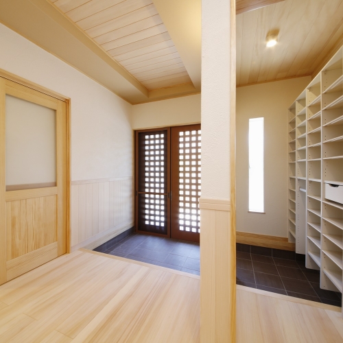 引き戸を開けると広々とした空間にもみの木のほんのりとした香りが感じられる玄関ホール。家族用入口は別にしてあるので正面はすっきり広々。室内からも映える格子の玄関ドアには網戸も設置しました。