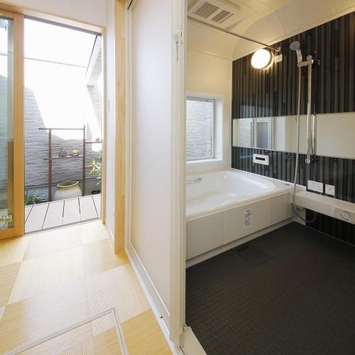 外壁で囲んだ坪庭風のスペースを設けた浴室。通りからの人目を気にする必要がなく、夏は全裸で夕涼み、なんてことも可能です。