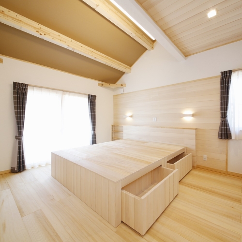 約半分を勾配天井にした主寝室は、ベッドももみの木で造作。引出収納も付いて各2つ(計4つ)に分かれるので、ベンチ収納として使用することもできます。2重サッシにしているので、外を通る車の音も気にならずにゆっくり休めます。