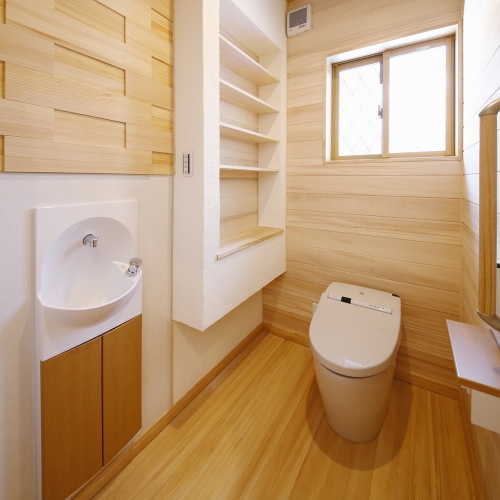 トイレは横幅を広くとっているので、手洗い器や手すりを設置しても十分なスペース。奥にもみの木の飾り棚も造作しているので、予備のトイレットペーパーはもちろん写真や小物、書籍を置いてみたりと便利に使えます。