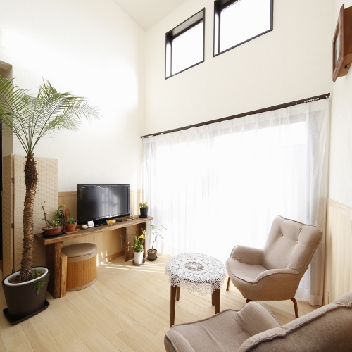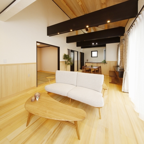 ナチュラル系和モダンの平屋は、勾配天井の広々LDK、続き間の和室、寝室にW.I.C.、フリースペース、中庭まである余裕の間取構成。もみの木や漆喰の自然素材で囲まれ、きれいな空気環境の中、暮らしを楽しむ住まいです。