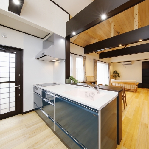 ダークブラウンの太い梁が印象的な勾配天井のリビングダイニング。梁下にダウンライトを設置し、空間の雰囲気を壊さない照明計画になっています。