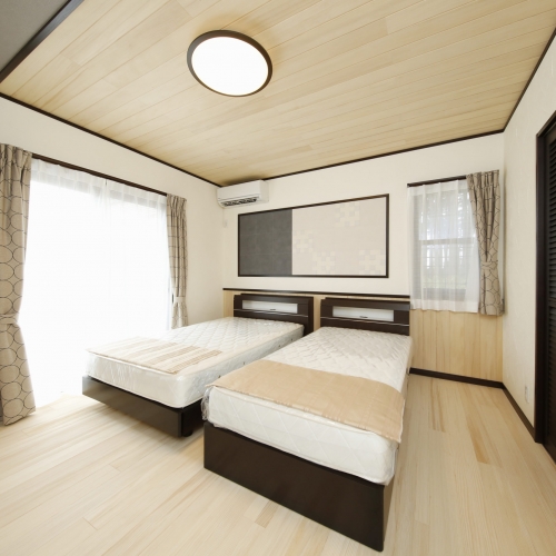 腰壁と天井にもみの木、壁の一部にエコカラットタイルを飾った主寝室。中庭に面しているので、シャッターが無くても外部からの視線を気にせず、朝日で自然に目覚めます。