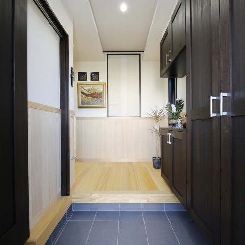 天井の中央部を折り上げ、正面にタイルを飾った玄関ホール。写真左手の扉を開けると、パントリー~キッチンへとつながり、買い物帰りの重い荷物を最短距離で運び入れることができるようになっています。