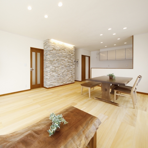 壁の一部に自然石タイルを施工したリビングダイニング。天井埋め込みの間接照明でより凸凹感を楽しめ、インテリアの良いアクセントになっています。