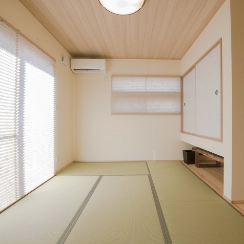 振り分けタイプの独立和室は、玄関側と水廻りの両方に出入口を設け使い勝手良く。吊押入下の床や天井にももみの木を採用し、お客様にお泊りいただくのにもちょうど良い落ち着く空間になっています。