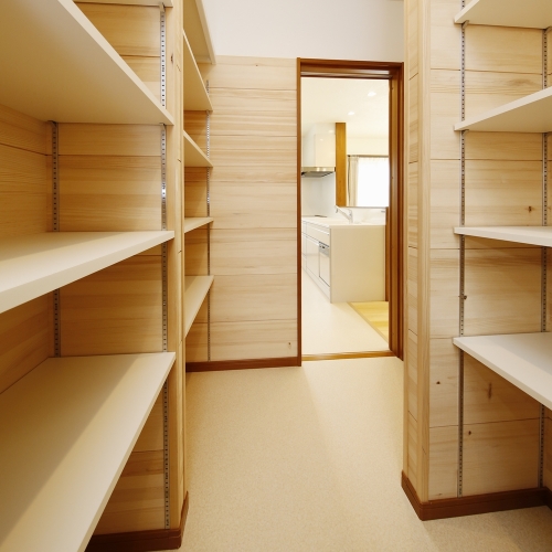 キッチン脇には両面に可動棚を造り付けた約3帖のパントリースペース。日常のストックも、緊急時の備えもたくさん収納できます。