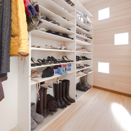 玄関内には靴箱を置かず、すぐ隣に大容量のウォークインシューズクロークを完備。片側全面に棚を設けているので、使い易く、床や壁に貼ったもみの木で、湿気や匂いもコントロール。