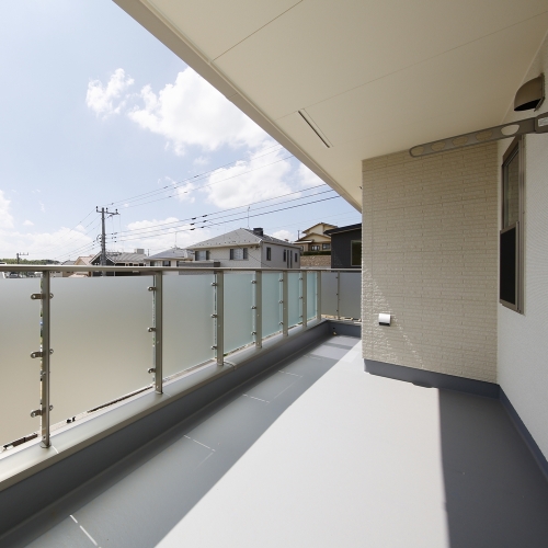 主寝室南側の広いバルコニー。奥行きもあり、広さも十分。一部屋根も有って便利です。手摺部分に半透明のガラスパネルを採用することで、周囲からの視線も遮られるので、洗濯物や布団を干すだけでは勿体無い、開放感のある空間になっています。