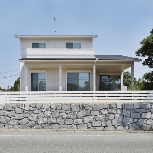 通りからの視線を外す石垣と、その上の白い柵、南側に大きく張り出したひさしが海辺のリゾート感を演出。ひさし下の南側全面にウッドデッキが施工されています。