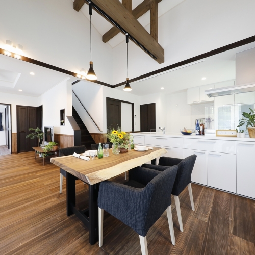 床と腰壁にブラウン色のもみの木を採用したリビングダイニング。木製家具はもちろん、革やガラス、金属性の家具とも相性バッチリです。開放感のある勾配天井ダイニングは梁見せに。梁部分は床と腰壁の色に合わせて現場で塗装しました。