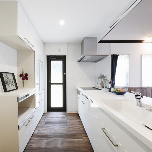 奥様ご希望の真っ白なキッチンには一部モザイクタイルをあしらいました。背面からでも手を伸ばせるフラットな対面式はホームパーティーなどでも大活躍しそうです。