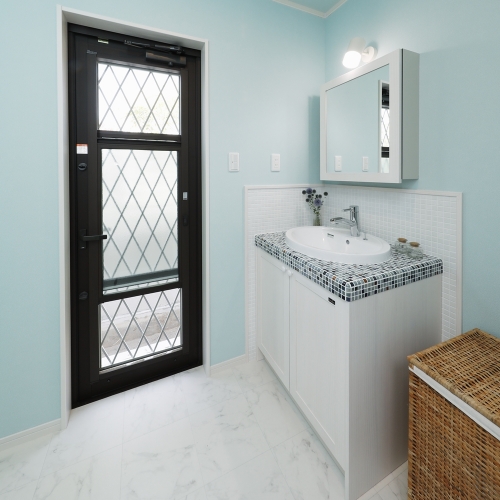 海帰りに外から直接入れるよう勝手口を付けた洗面脱衣室。爽やかな水色の壁紙に、モザイクタイルを使った洗面台がかわいいです。